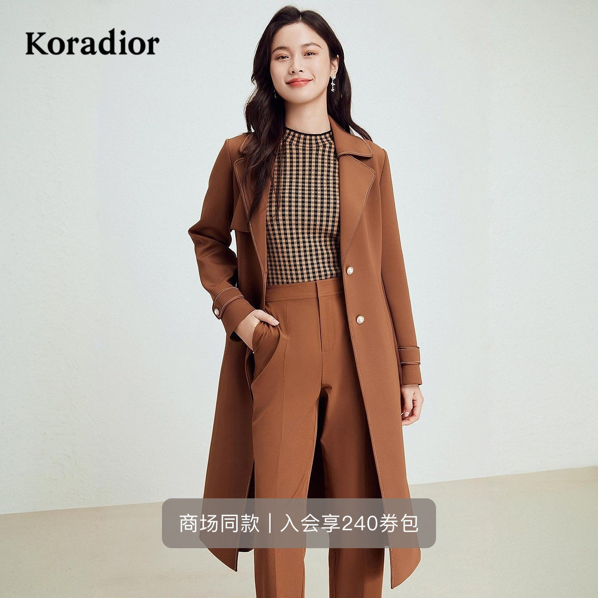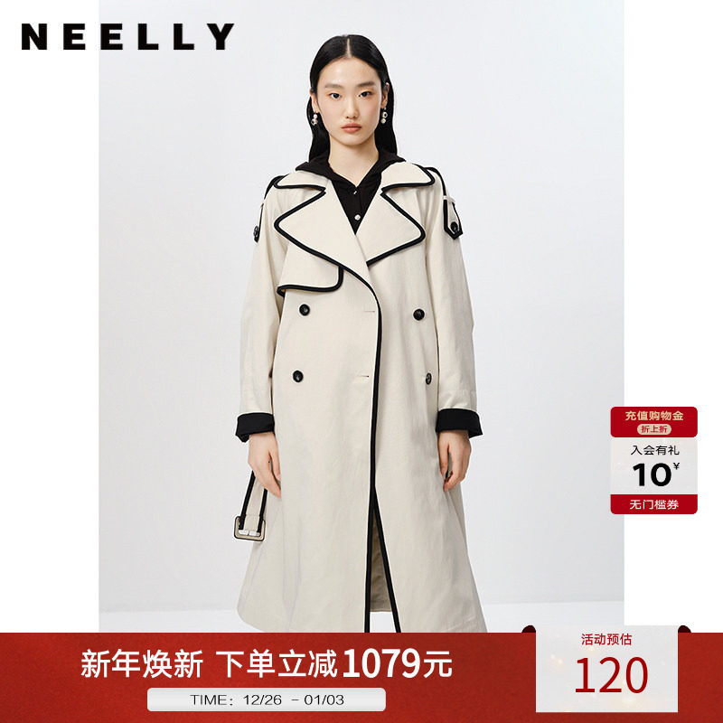 NEELLY纳俪撞色大翻领双排扣风衣女中长款收腰大衣通勤百搭外套