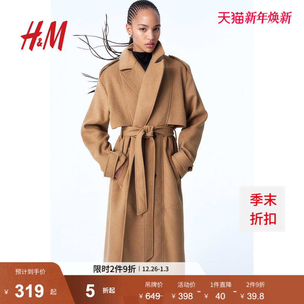 HM女装风衣冬季斜纹布收腰双排扣翻领中长款老钱风大衣1247470