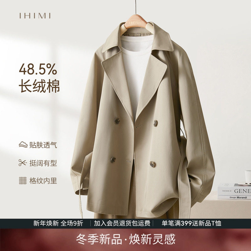 IHIMI海谧长绒棉双排扣时髦风衣女秋季高级感中长款百搭收腰外套