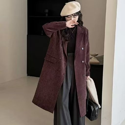 毛呢外套女秋冬中长款双排扣夹棉西装领大衣过膝大码慵懒风衣宽松