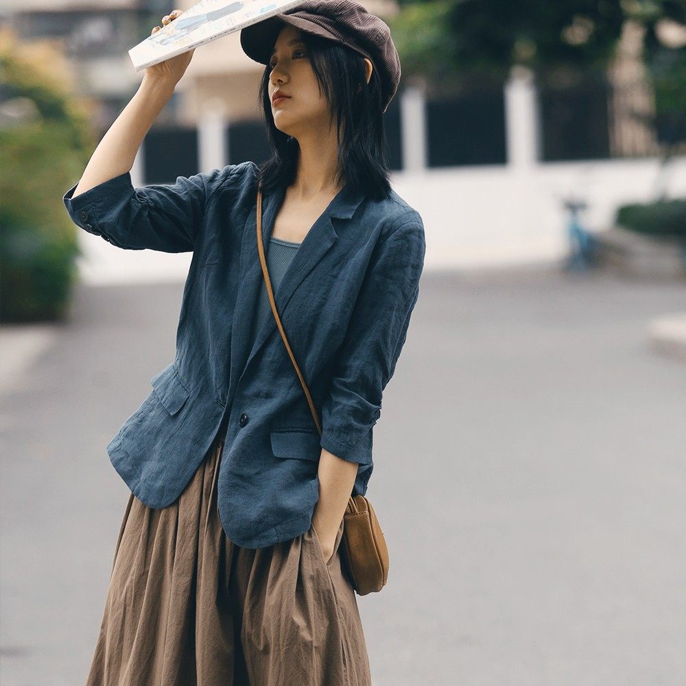 春夏薄款亚麻小西装原创文艺简约西装修身显瘦百搭纯色麻料外套女