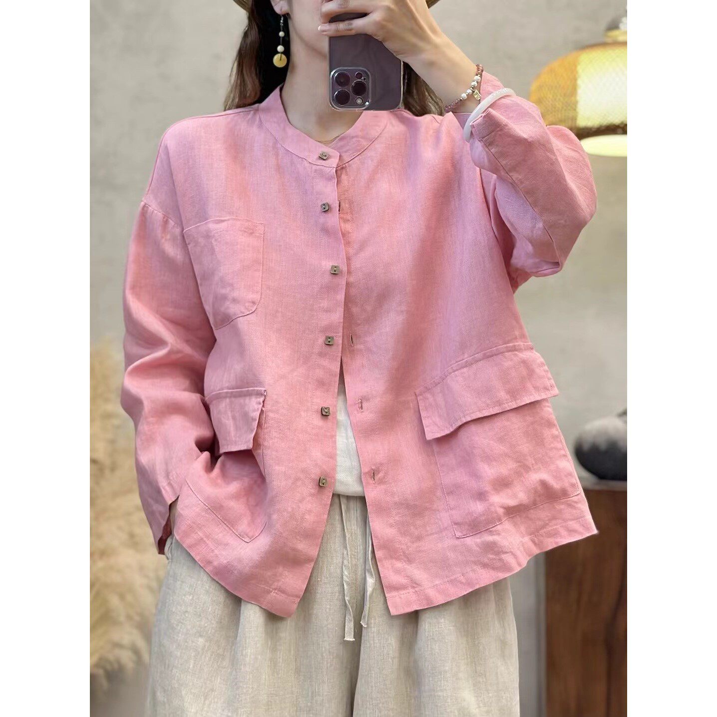 2026年春秋慵懒风亚麻小西装短外套女圆领休闲文艺复古百搭上衣潮