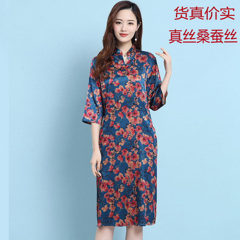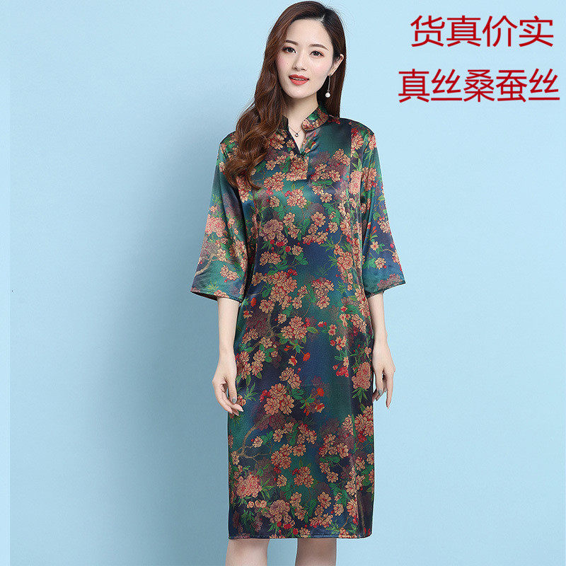 真丝连衣裙女宽松富贵牡丹桑蚕丝气质妈妈装大码中长裙子正品清仓