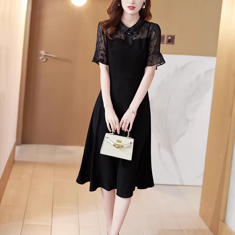 真丝碎花裙连衣裙女气质短袖黑色夏季显瘦缎面新款大码桑蚕丝长裙