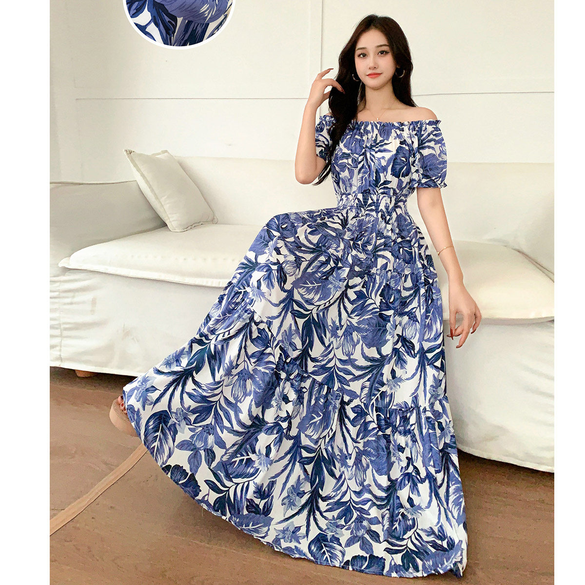 波西米亚碎花棉绸大摆裙连衣裙长裙沙滩裙度假裙印花一字领甜美夏