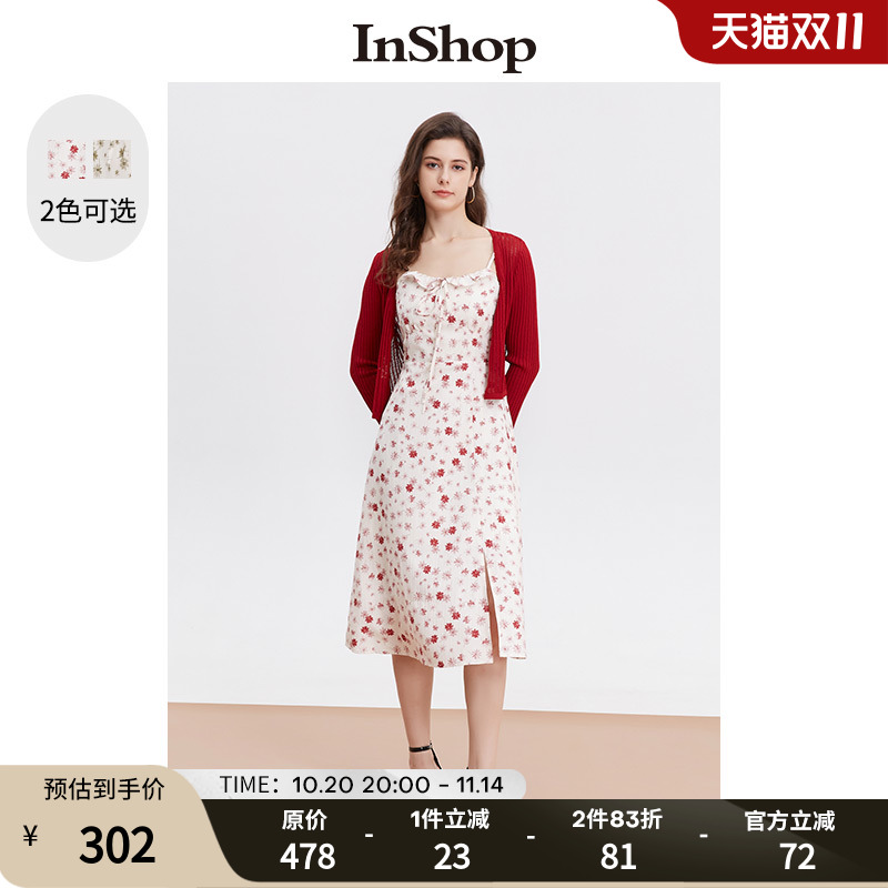 oo&vv2025新秋法式复古碎花吊带连衣裙+针织开衫外套两件套装女