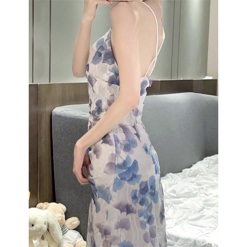 法式蓝色碎花吊带连衣裙女收腰长裙春夏2025新款开衫配裙子两件套