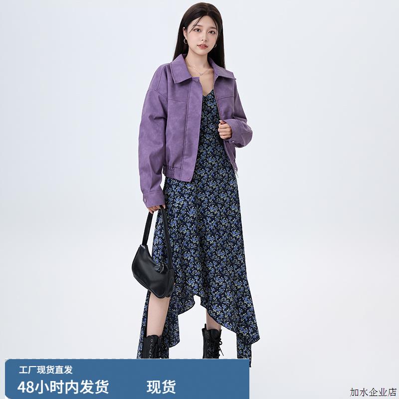 小香风套装女2025新款爆款美式紫色夹克外套吊带碎花连衣裙两件套