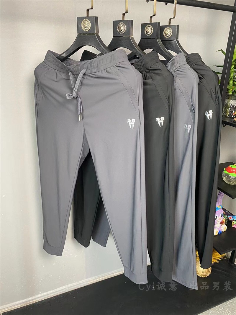 撤柜休闲裤男士夏季薄款透气弹力运动裤纯色刺绣束脚九分裤 K6105