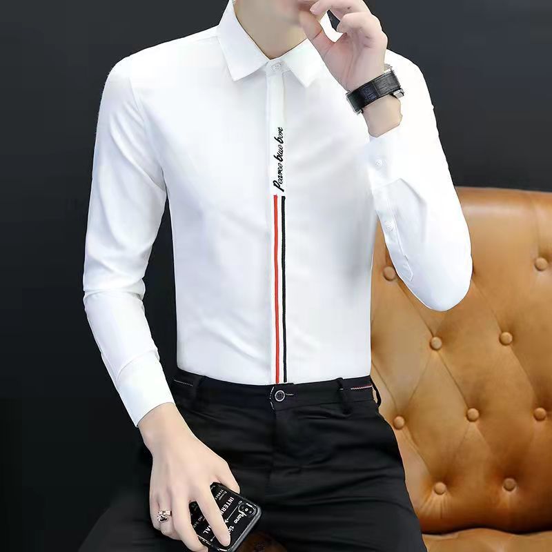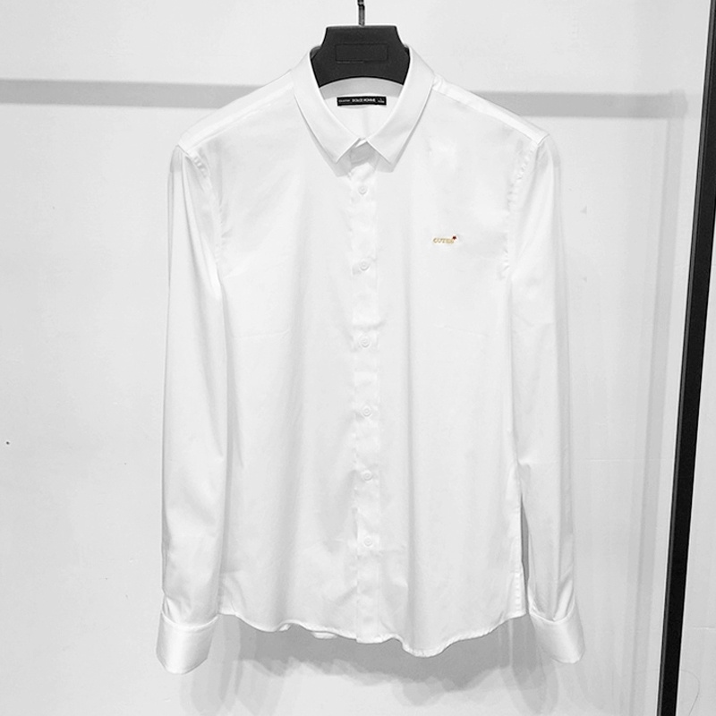 衬衫男长袖休闲时尚商务百搭免烫纯色衬衣秋季修身领口刺绣白衬衫