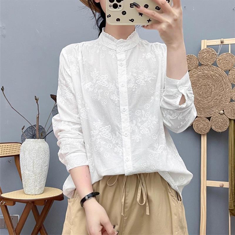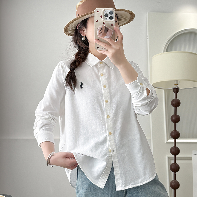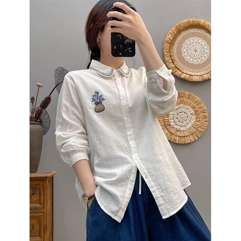 刺绣白衬衫女款2025新款秋纯棉长袖宽松休闲气质减龄翻领打底衬衣