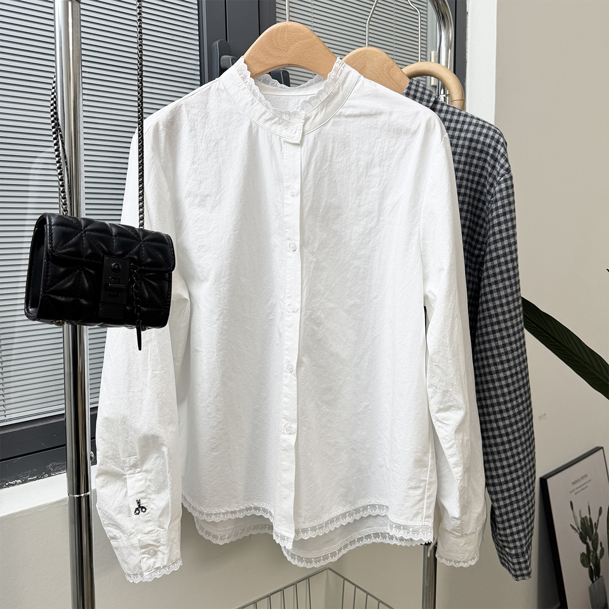 早春新款设计剪刀刺绣白衬衫女式法式超仙立领蕾丝边叠搭全棉衬衣