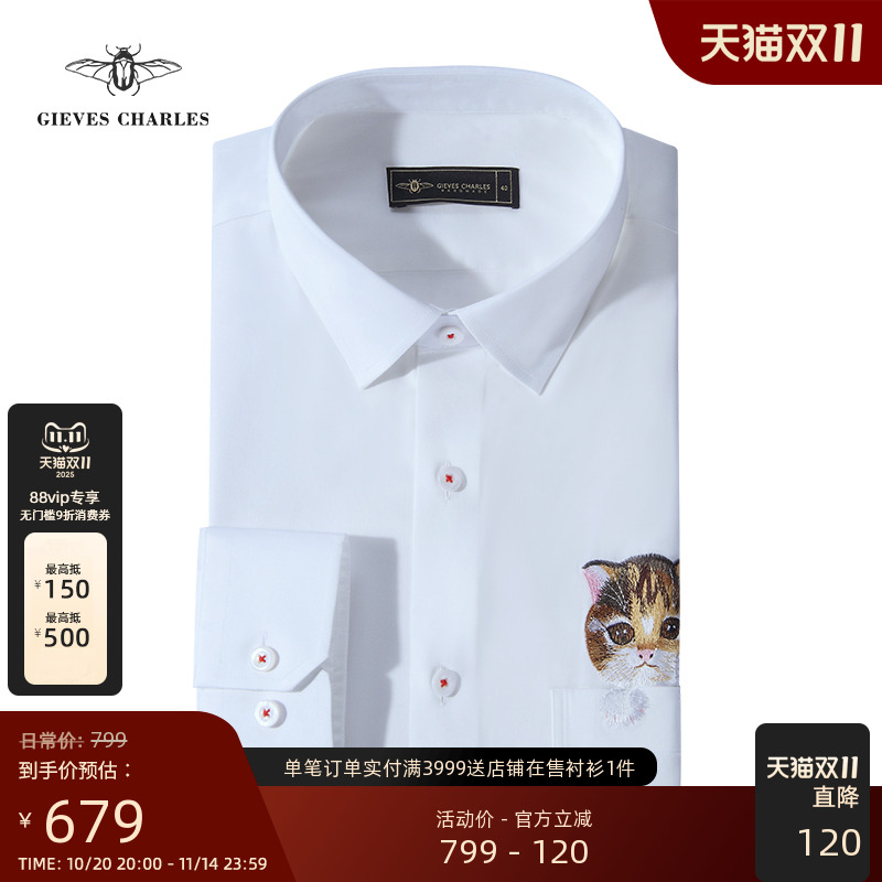 GIEVES CHARLES设计感口袋猫咪刺绣白衬衫男士高端时尚都市衬衫男