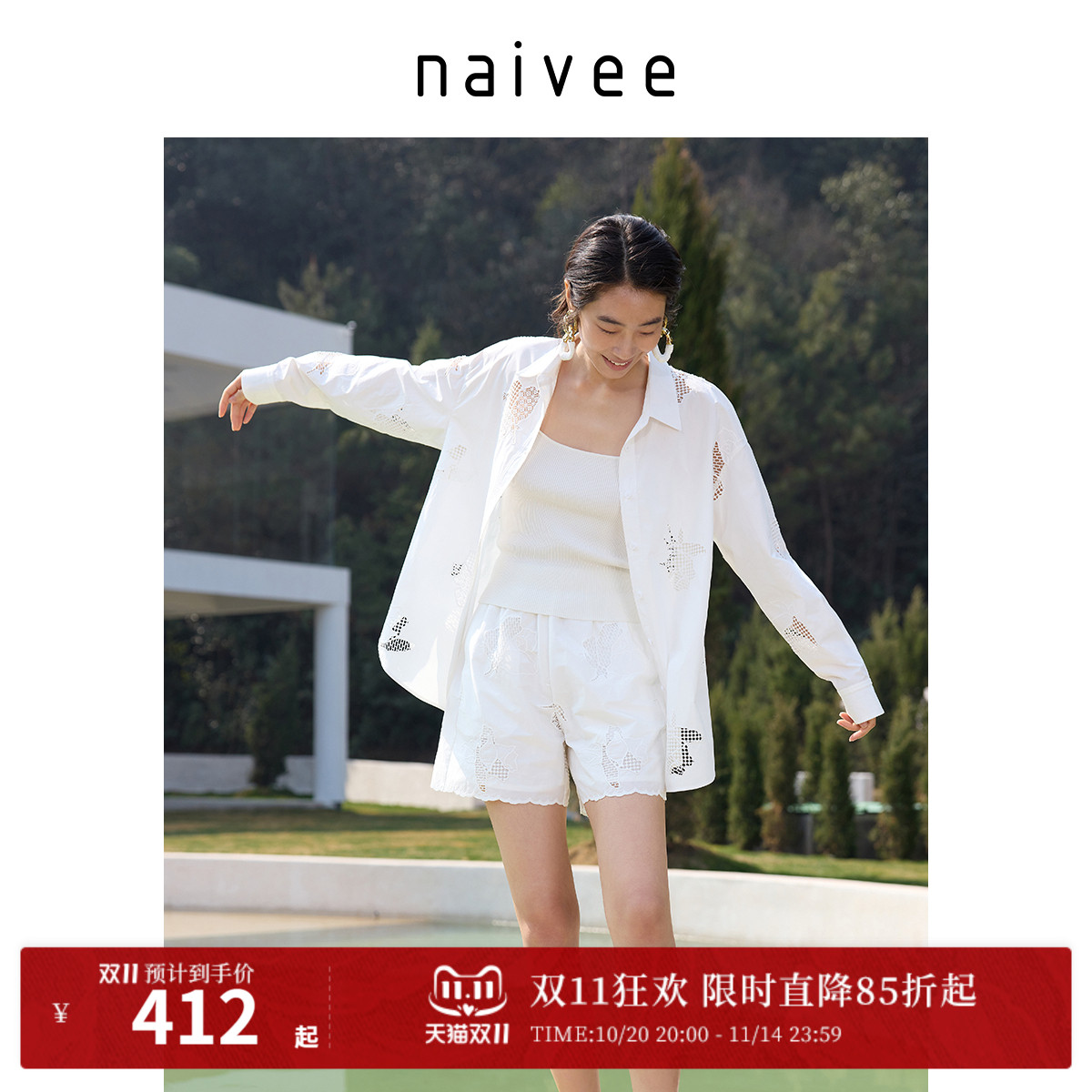 naivee纳薇镂空刺绣白衬衫女25秋新款重工绣花上衣短裤套装度假风