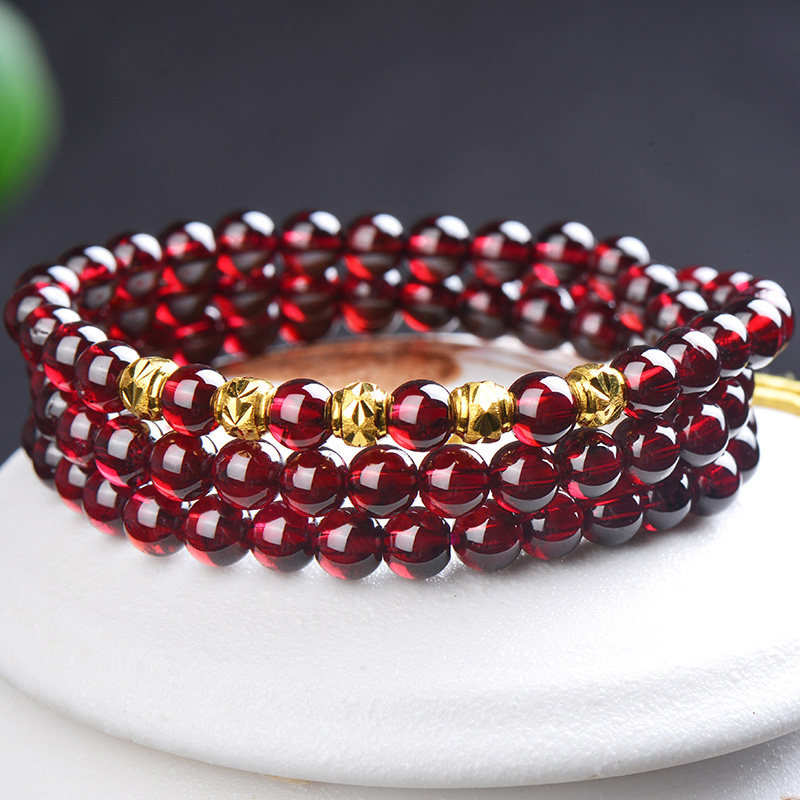 黄金转珠运手链女天然酒红石榴石三圈多圈手串正品本命年新年礼物