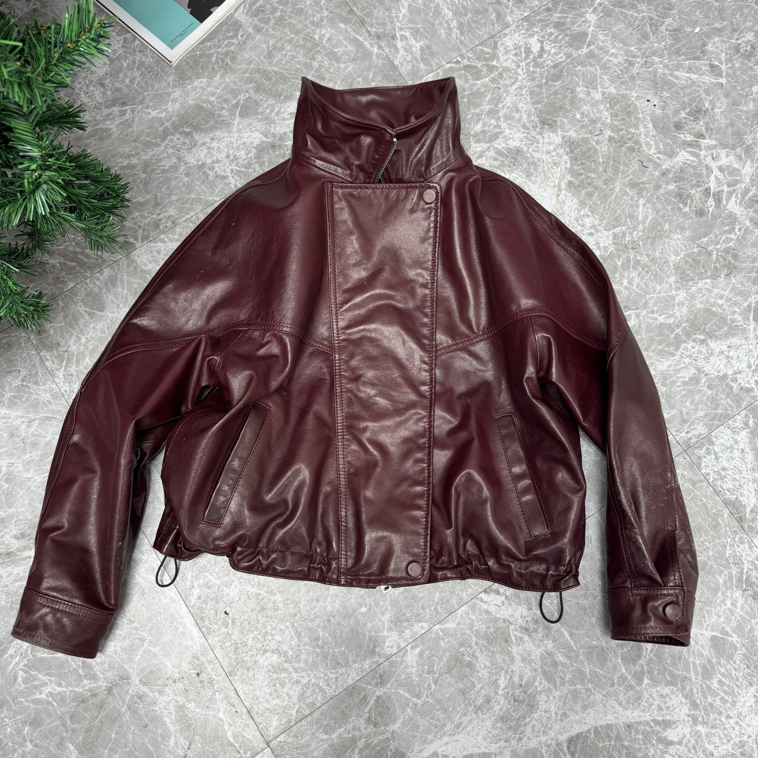 2025春款新欧洲站复古洋气个性斜扣立领短款洋气蛋白皮衣夹克外套
