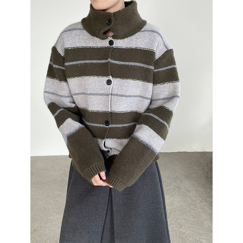 欧洲站2026春款韩系立领撞色条纹保暖毛衣外套女软糯宽松复古上衣