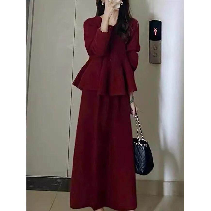 欧洲站秋装2025年新款法式覆古红色针织套装裙子秋冬款毛衣两件套