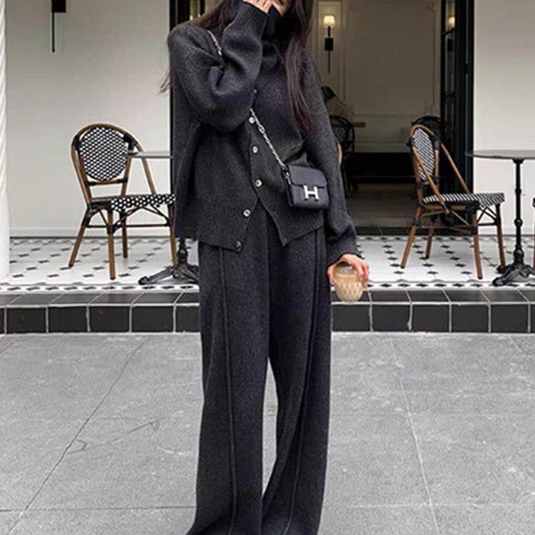 欧洲站2025秋冬韩系针织高领毛衣阔腿裤女装休闲加厚洋气两件套装