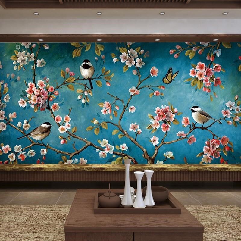 新中式墙纸3d立体花鸟电视背景墙壁纸客厅壁布卧室墙布影视墙壁画
