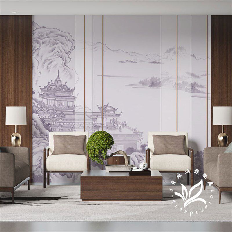 轻奢新中式墙纸拼色山水壁布电视背景墙壁纸客厅宋氏美学楼阁墙纸