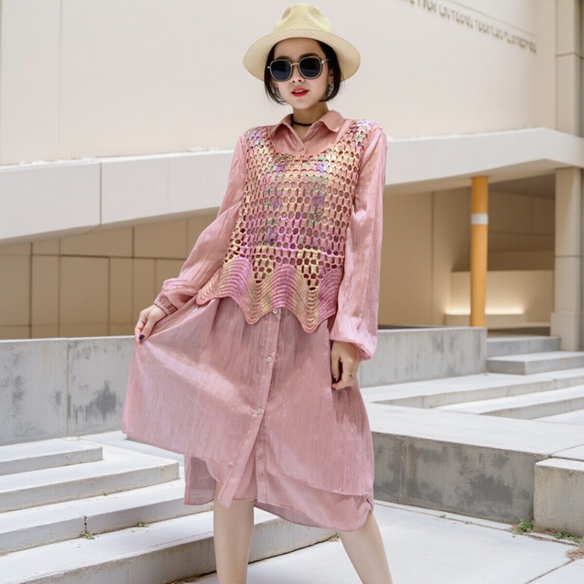 民族风宽松烫晶两件套衬衣女时尚长袖秋叠穿马甲遮肚雪纺衫中长款