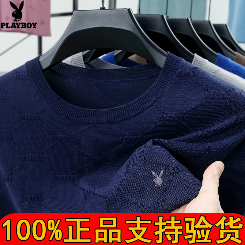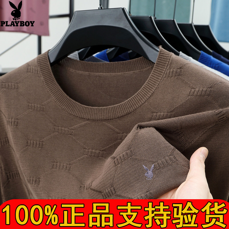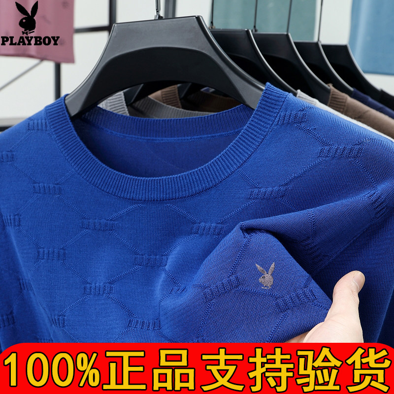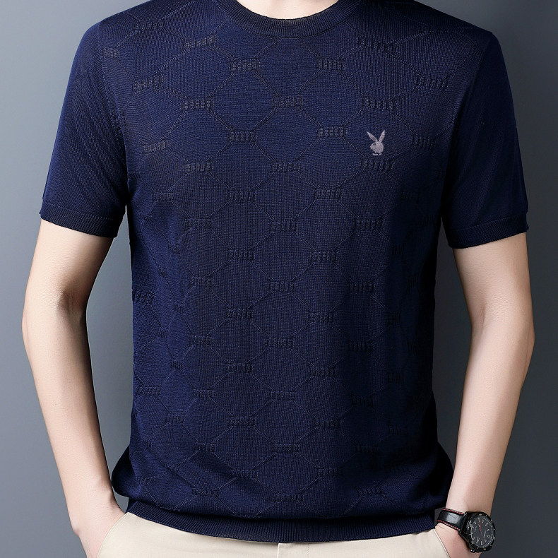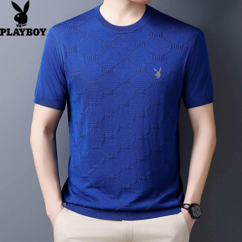 花花公子短袖毛衣男夏季圆领针织打底衫薄款半截袖汗衫男提花小衫