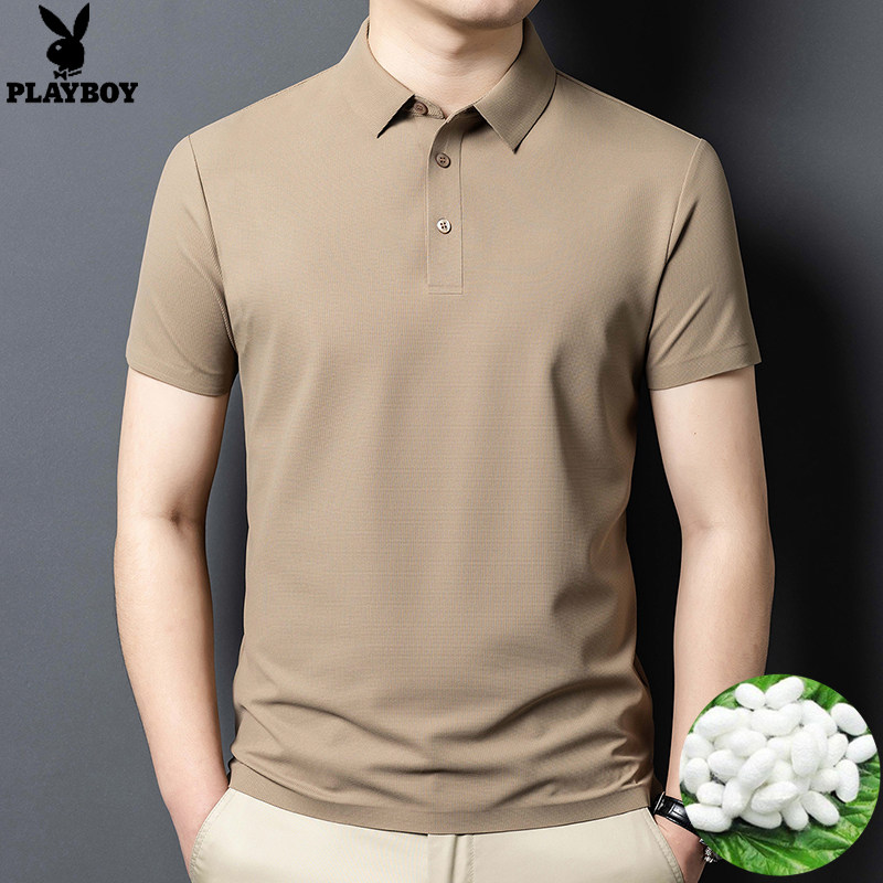 花花公子短袖t恤男2025夏季新款中年纯色桑蚕丝翻领男装POLO衫男