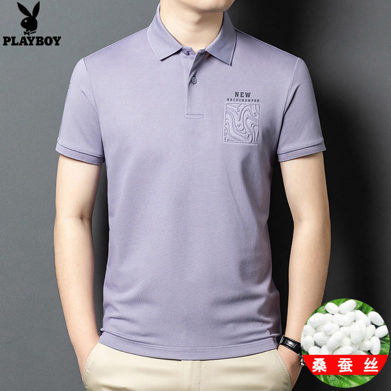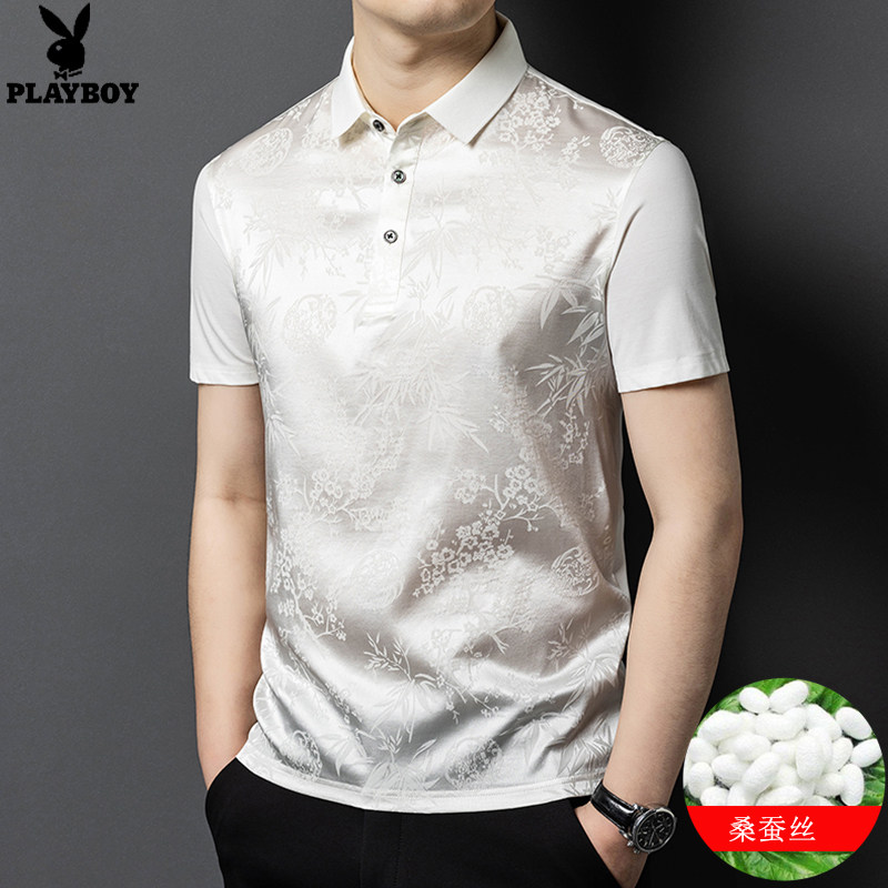花花公子短袖t恤男桑蚕丝夏季翻领休闲体恤衫上衣服装半袖棉T恤男
