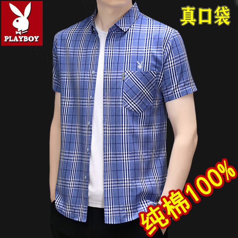花花公子纯棉短袖衬衫男士中年薄款高端免烫格子半袖衬衣爸爸夏装