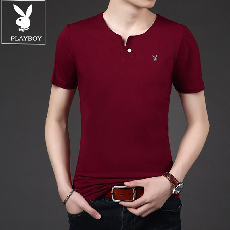 花花公子2025新款V领男士短袖t恤纯棉夏季潮流体恤土丅夏天上衣服