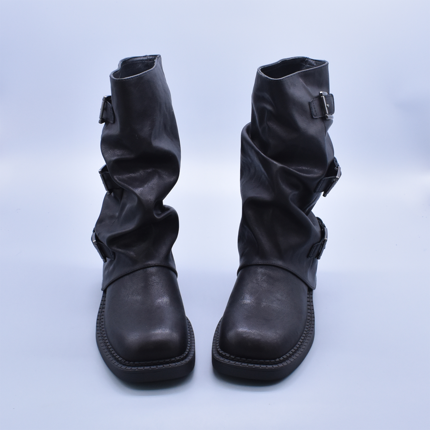 2025新款百搭皮带扣中筒靴子女鞋单靴复古粗跟西部裤管靴堆堆靴女