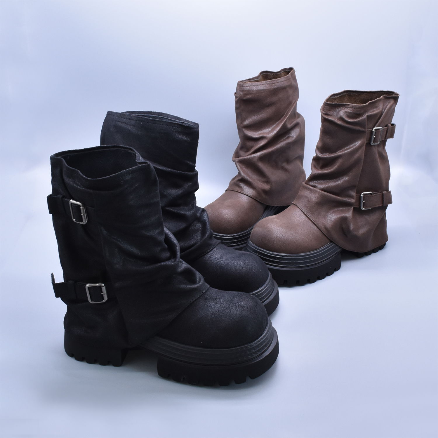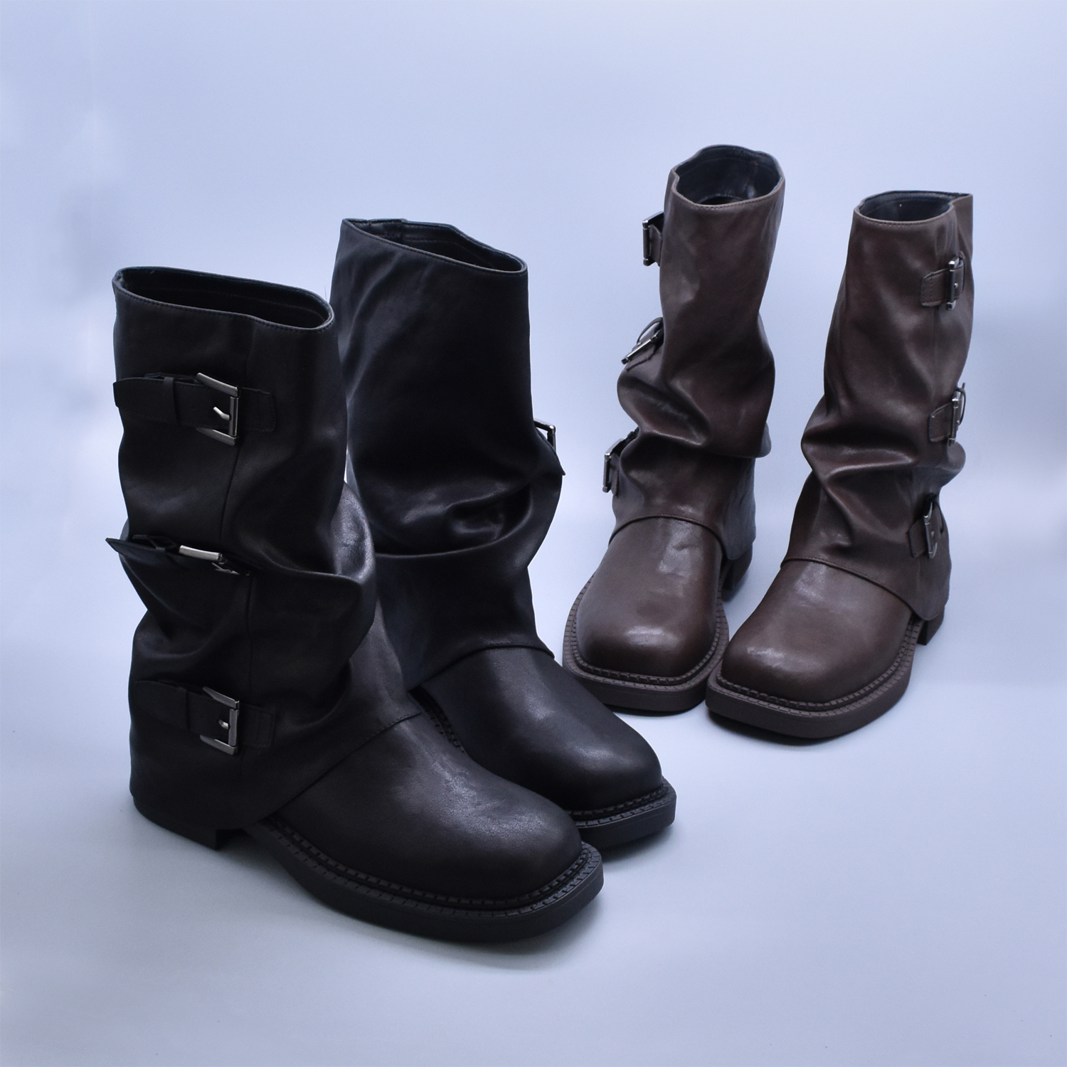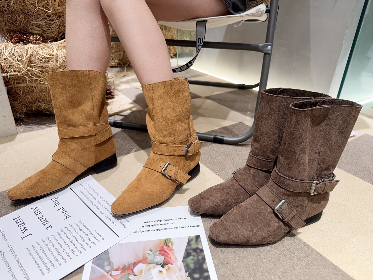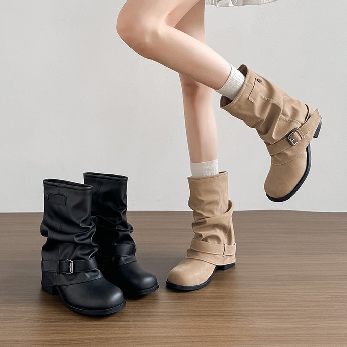2025绒里百搭皮带扣中筒靴子女鞋单靴复古粗跟西部裤管靴堆堆靴女