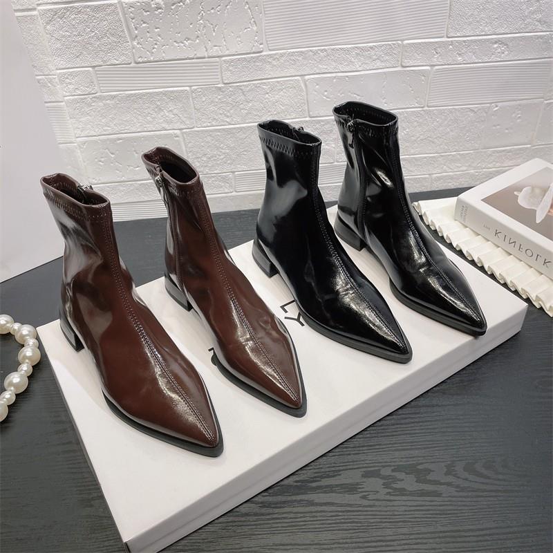 2025年冬季新款时尚尖头短靴女鞋单靴平底粗跟裸靴软皮弹力瘦瘦靴