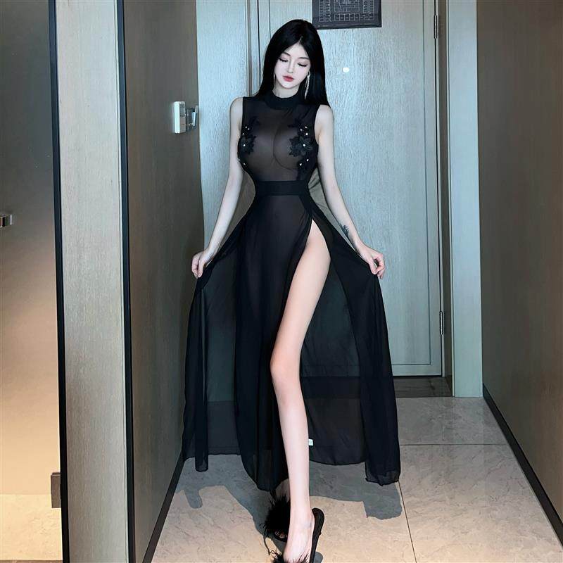 性感夜场佳丽晚礼服桑拿足疗技师工作服黑色透视开叉连衣裙女夏季