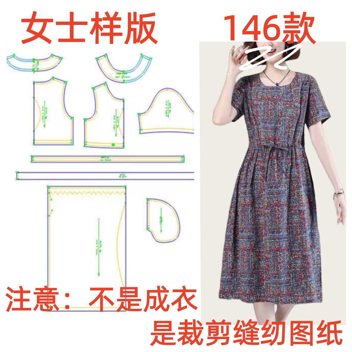 连衣裙女纸样夏新款服装裁剪图纸宽松146妈妈收腰a字裙衣服样板