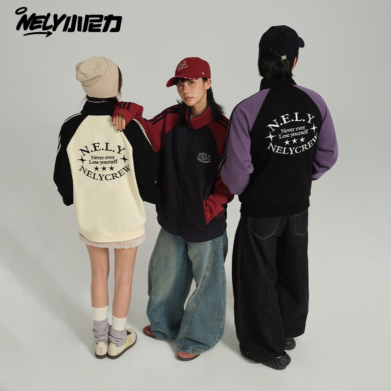 NELY小尼力插肩拉链卫衣潮牌bf男女秋冬字母刺绣加绒宽松运动外套