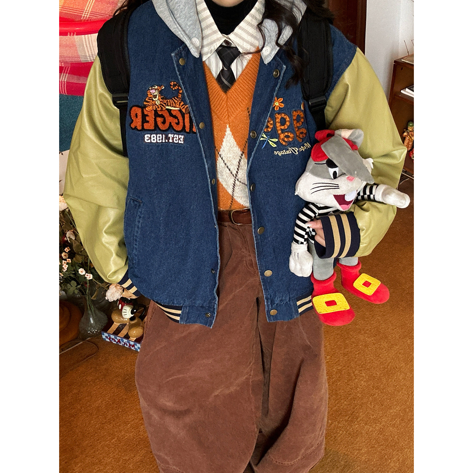 C2自制/美式复古风牛仔拼皮棒球服女刺绣宽松bf情侣2026春款外套
