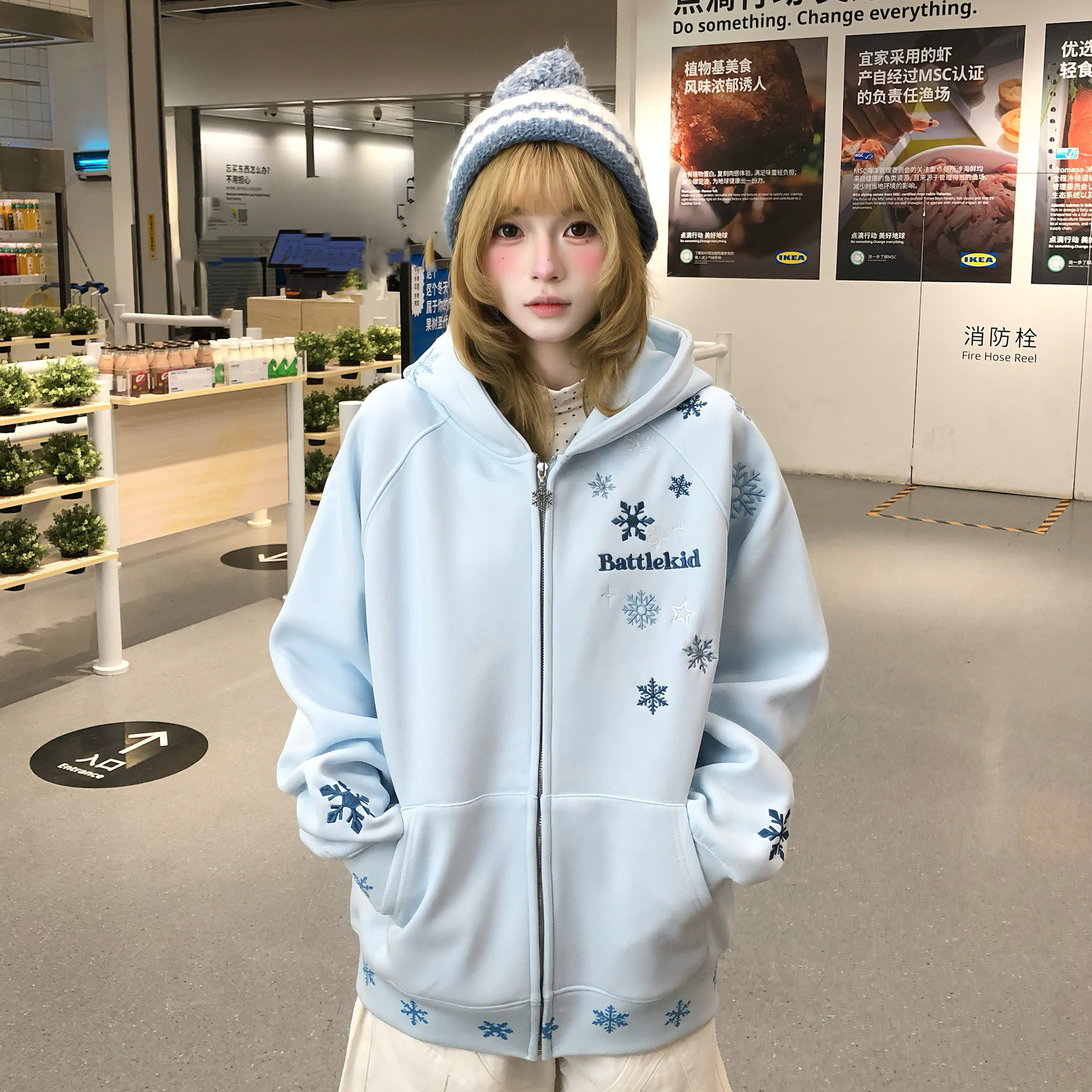 文文不乖美式满印雪花刺绣加绒开衫外套女宽松bf慵懒情侣连帽卫衣