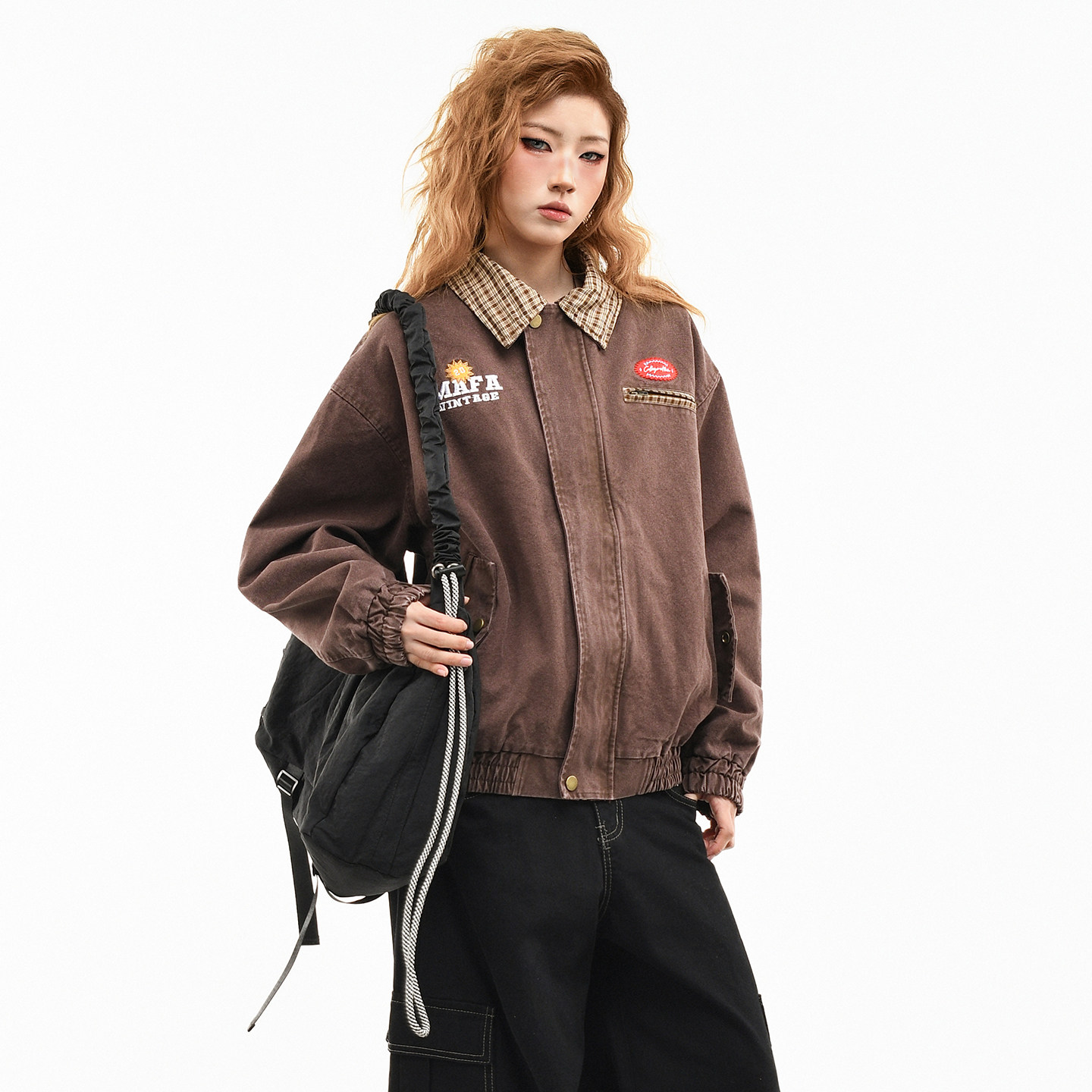 OV原创美式复古撞色翻领刺绣工装夹克女春季宽松bf做旧水洗外套男
