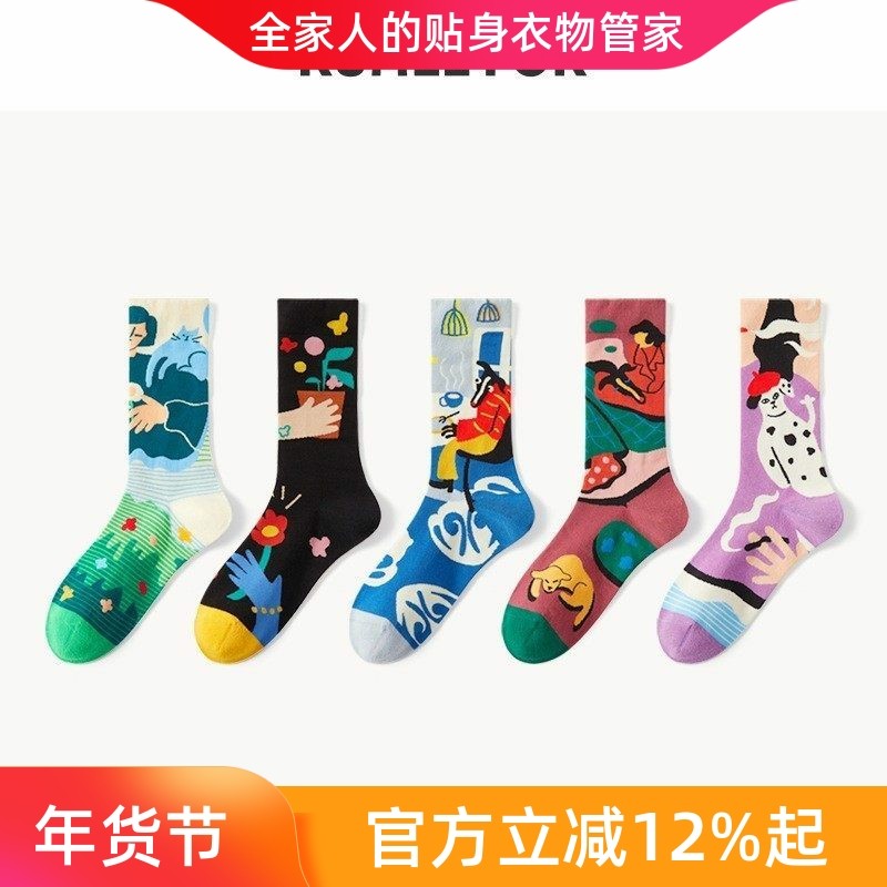 5双纯棉袜子女款中筒袜男士春秋季设计感ins潮复古薄款插画青少年