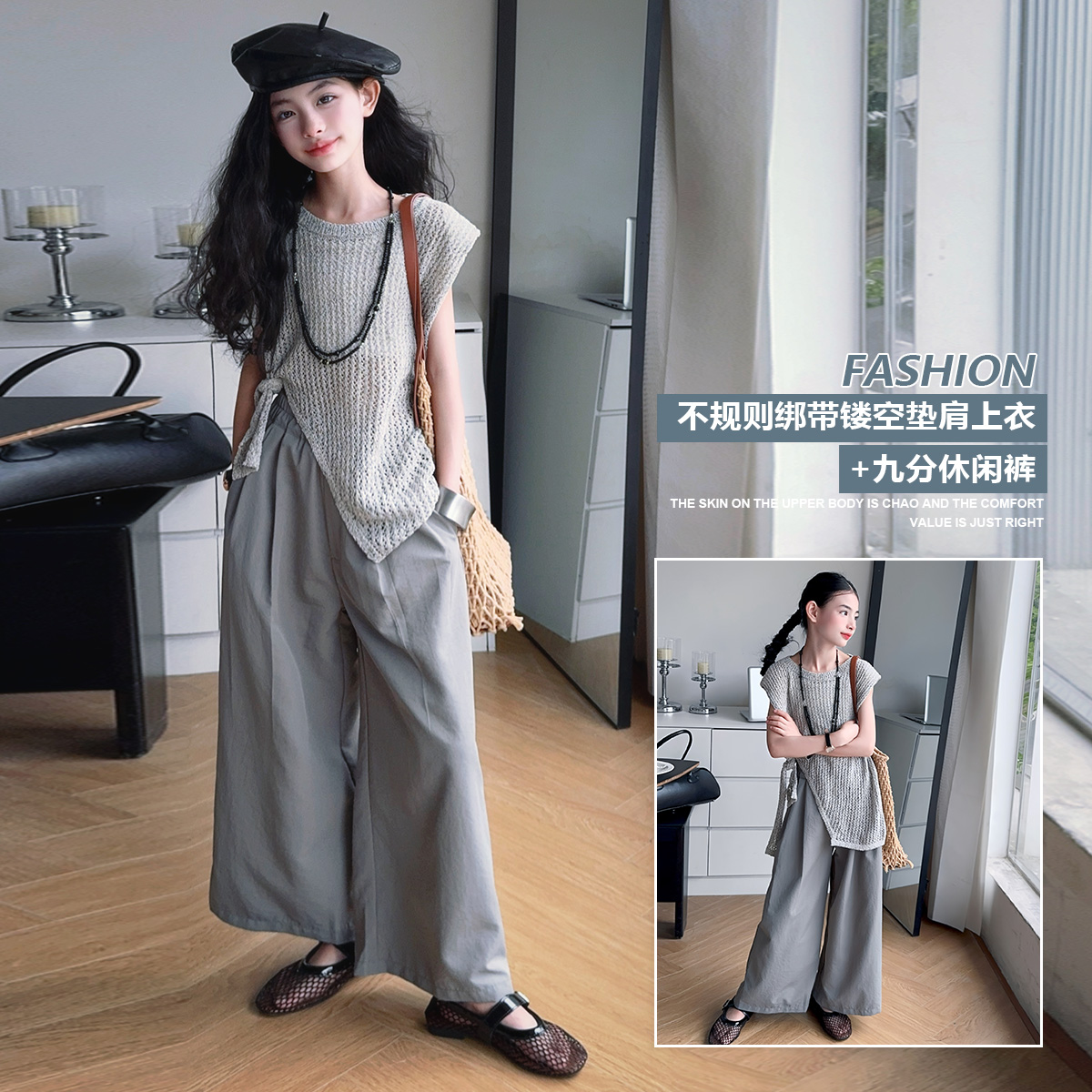 巨好看的夏装新款女童设计感时尚镂空无袖上衣高腰阔腿休闲裤套装