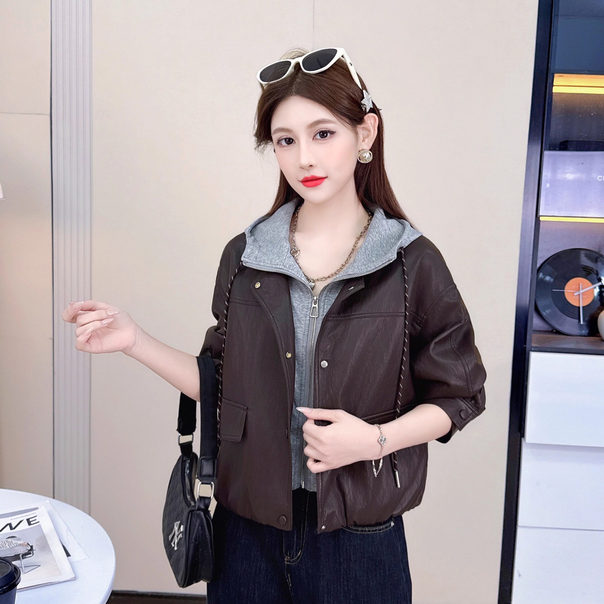 2026年春秋加绒时尚开衫机车连帽皮衣外套女设计感小个子女士夹克