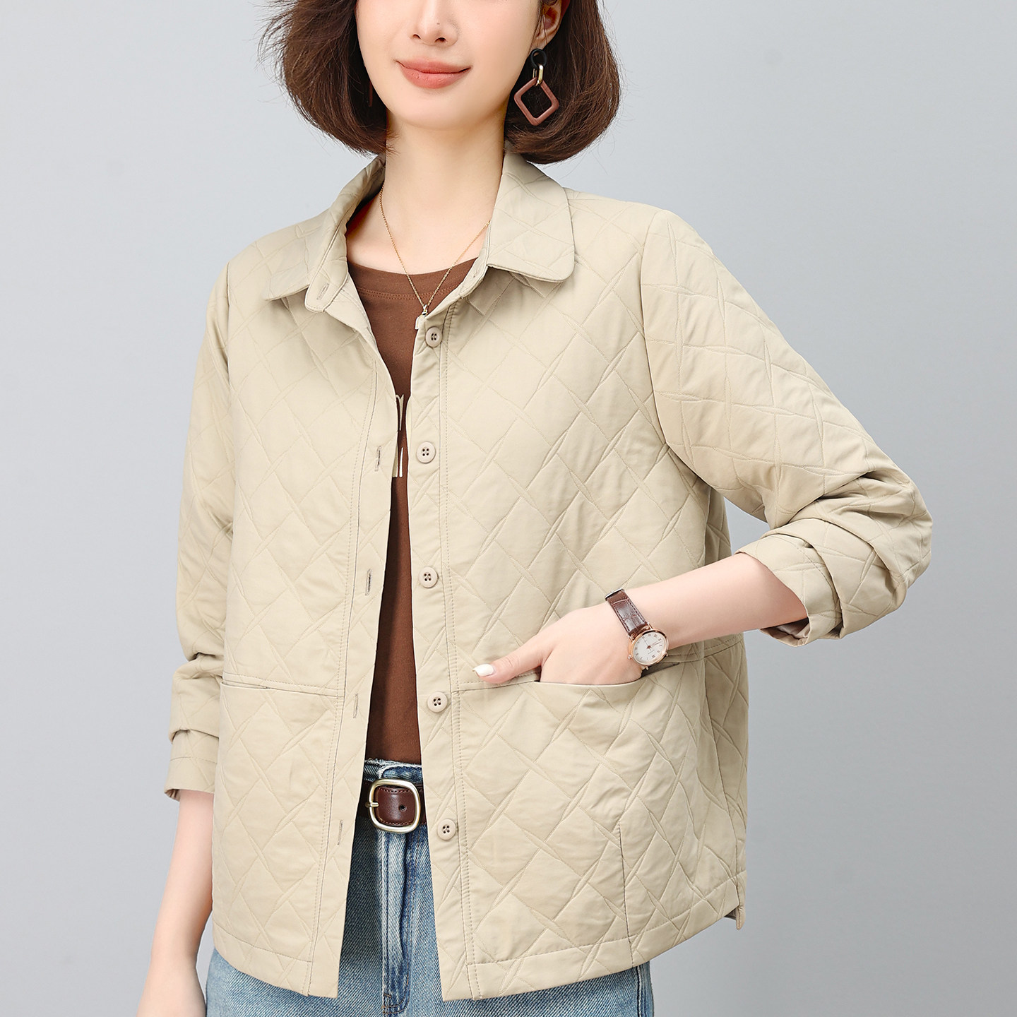 休闲外套女春秋季2026新款高级感中年妈妈小个子洋气翻领夹克上衣