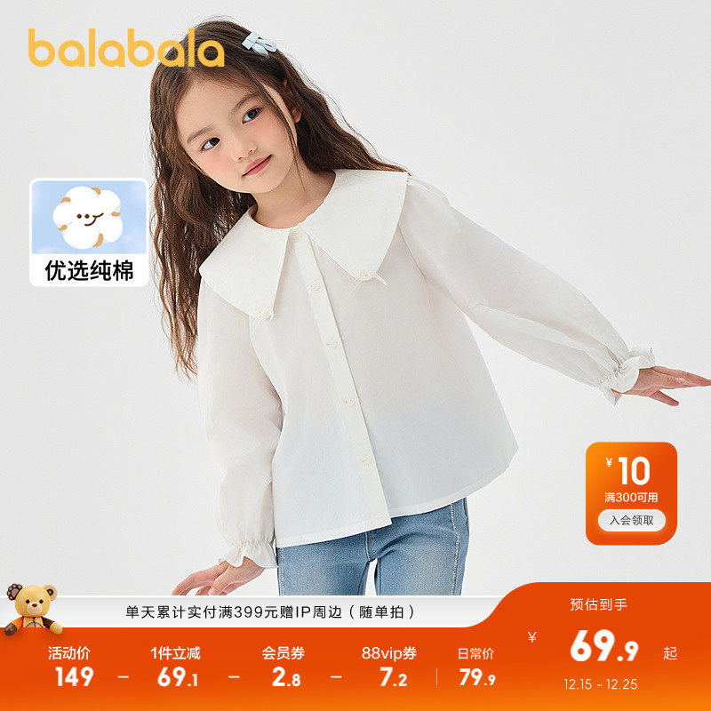 巴拉巴拉童装女童长袖衬衫儿童纯棉白衬衣2025春秋装新款上衣时尚