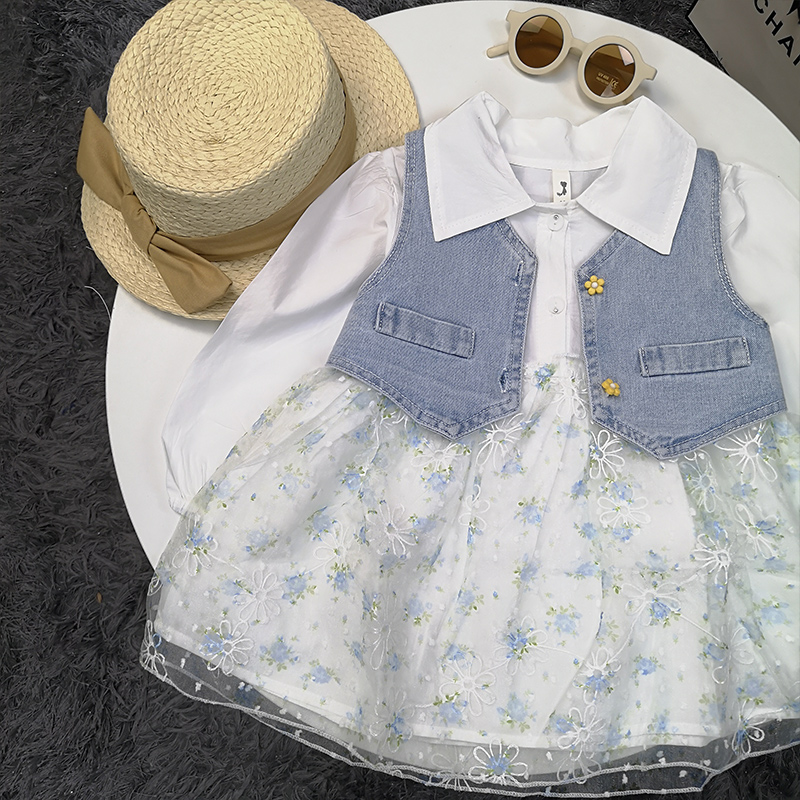 断码清仓女童连衣裙秋季牛仔马甲长袖网纱欧根纱蓬蓬裙公主裙套装