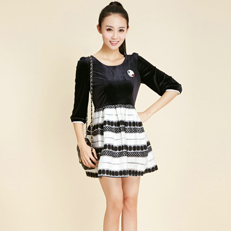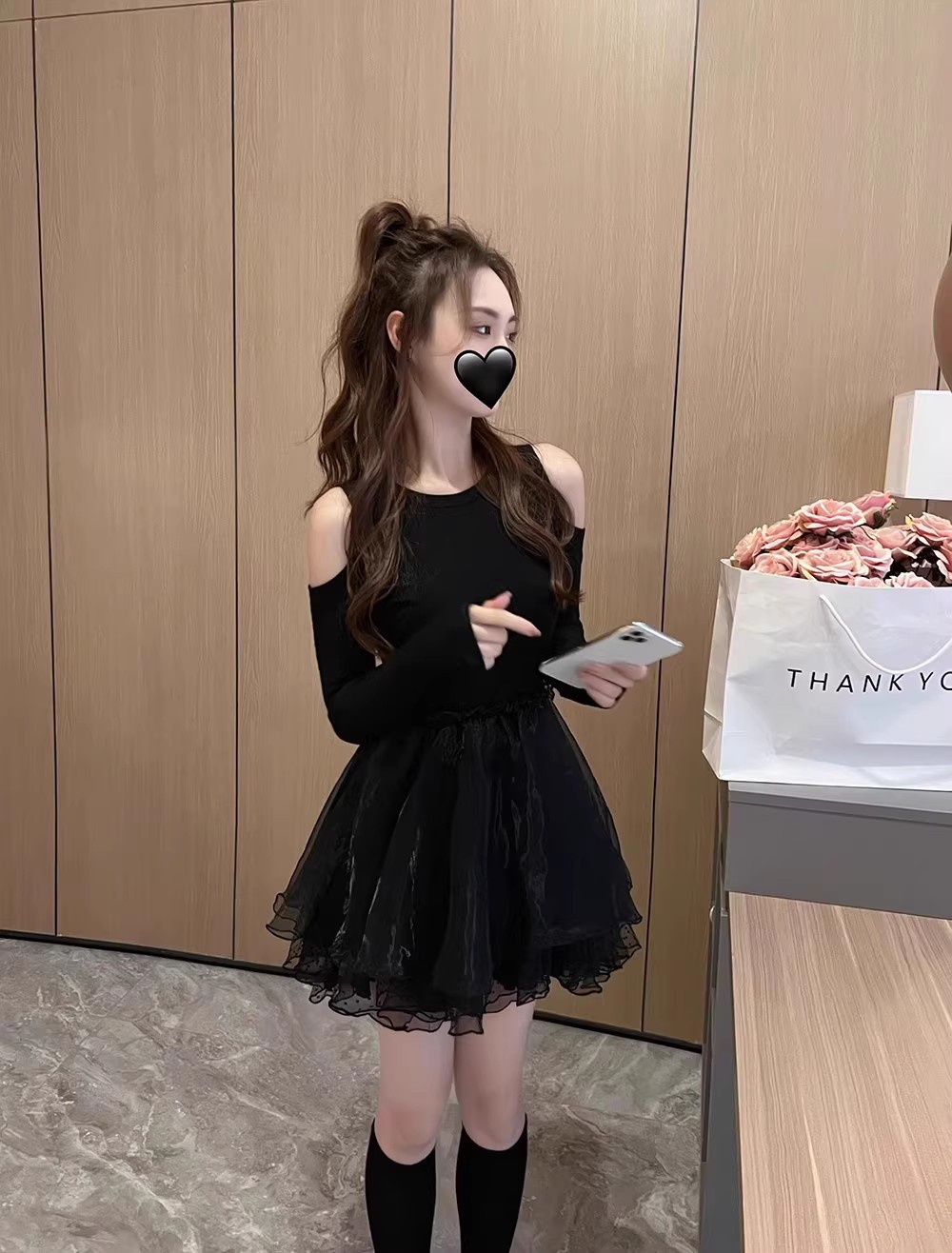 秋春季小码矮小个子150CM短裙针织长袖露肩高腰欧根纱蓬蓬连衣裙
