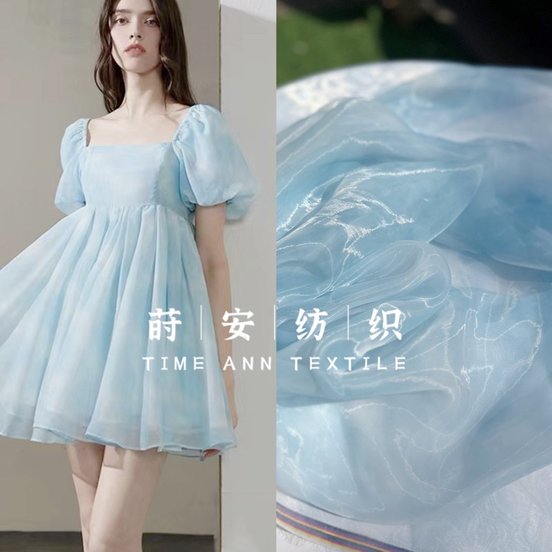 蓝白色云朵扎染晕染欧根纱布料连衣裙蓬蓬裙设计春夏高端服装面料