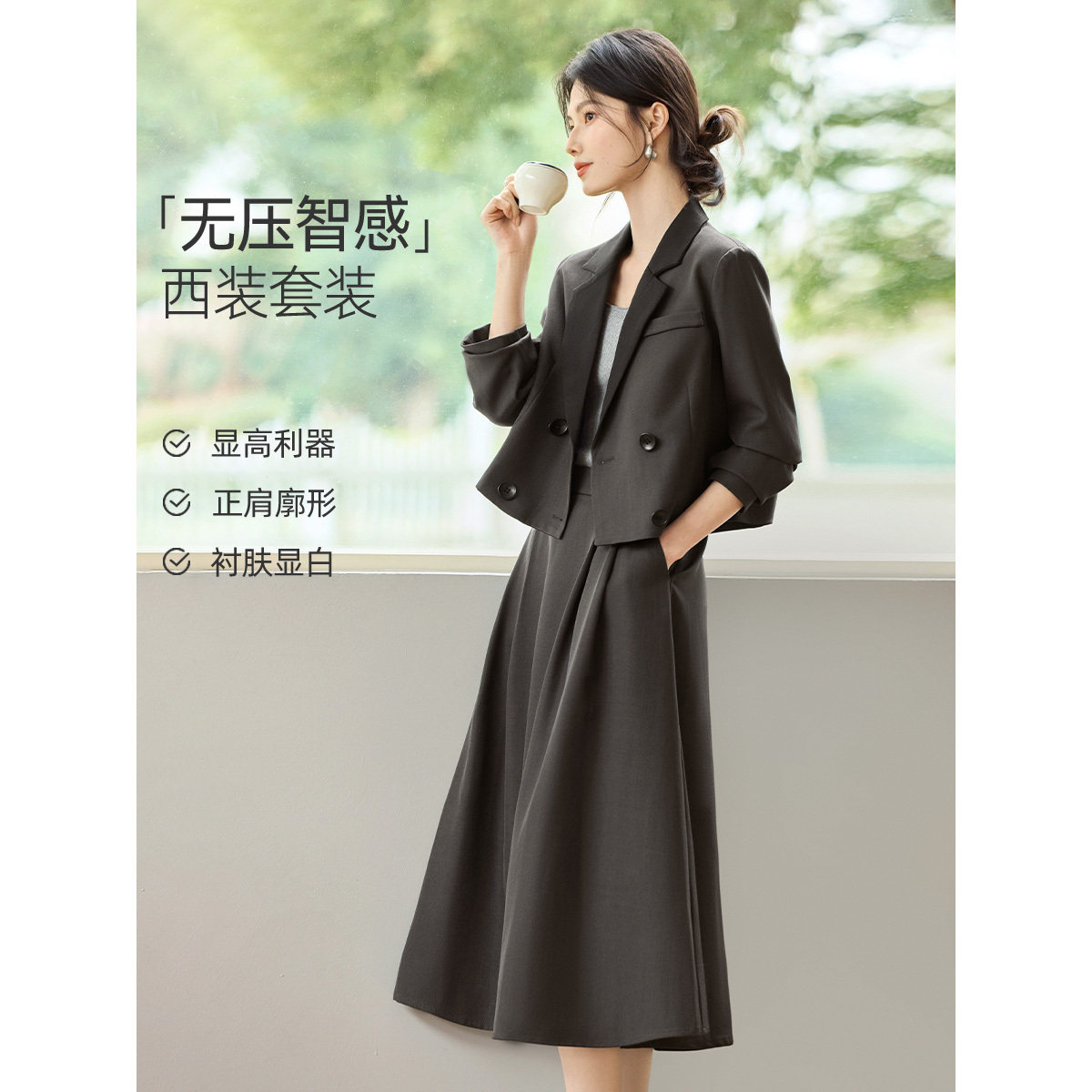 韩系高级感灰色西装套装女春秋季通勤气质小个子西装半身裙两件套
