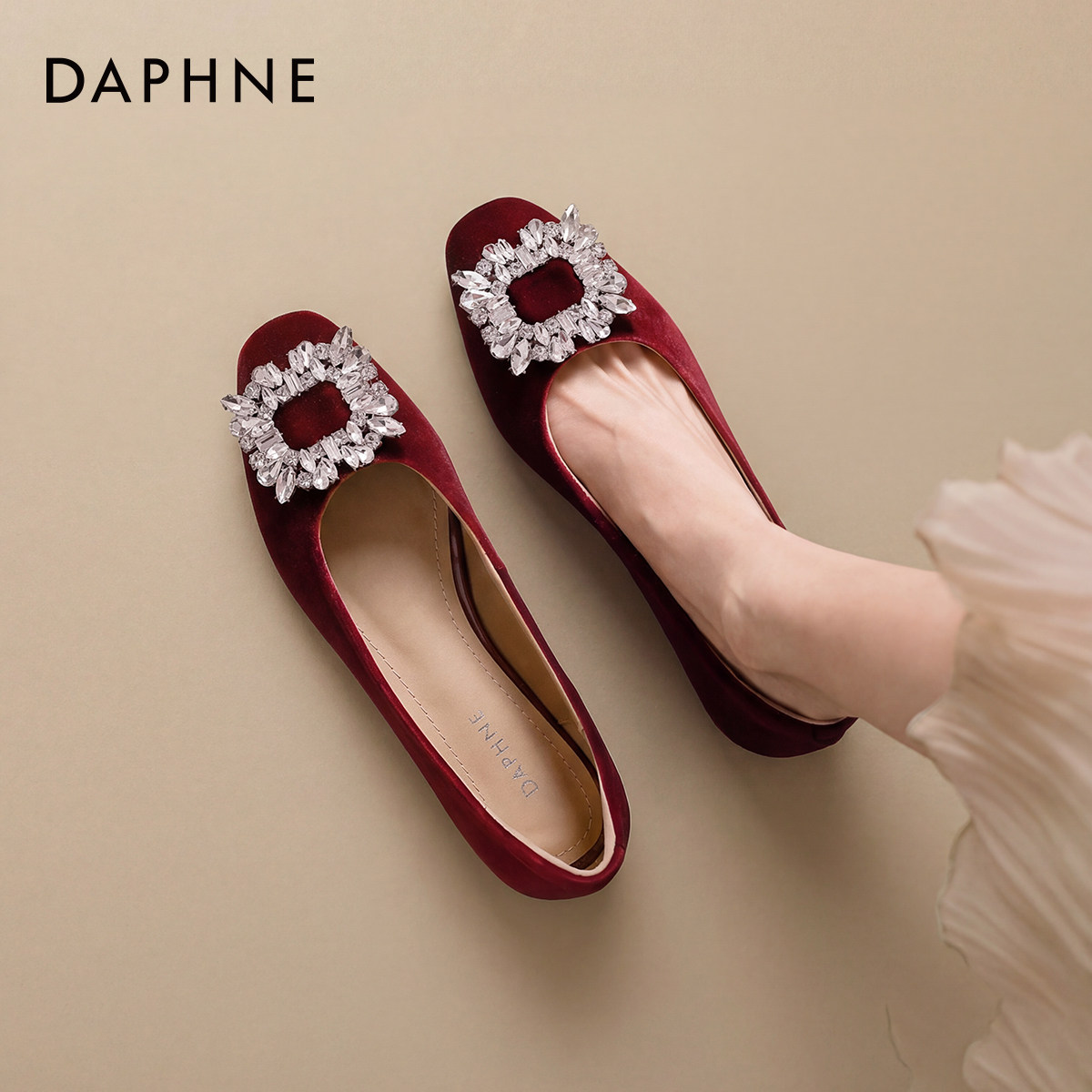 达芙妮红色单鞋女款2026新款春夏季浅口瓢鞋水钻平底女鞋法式婚鞋